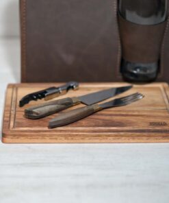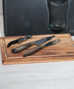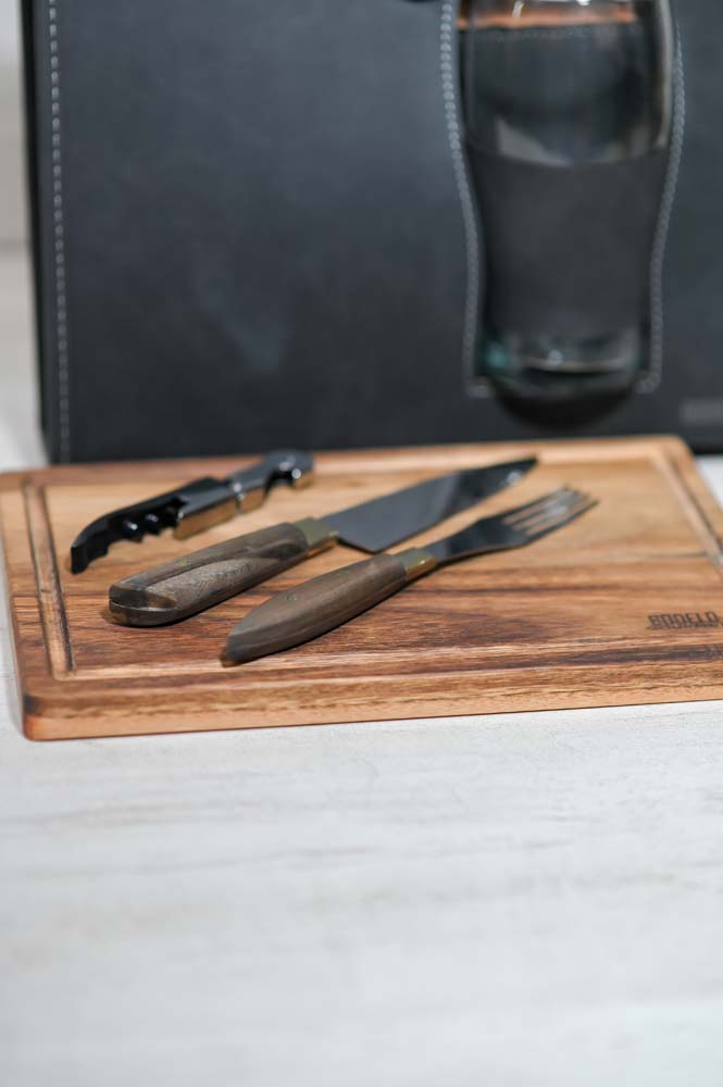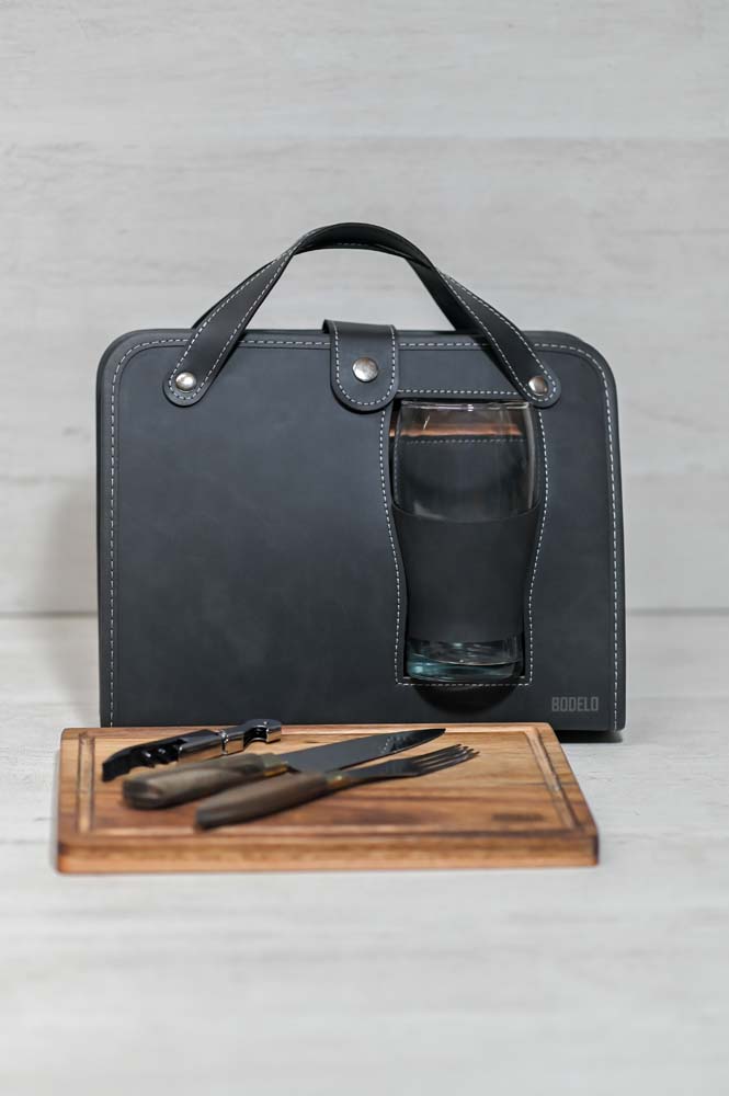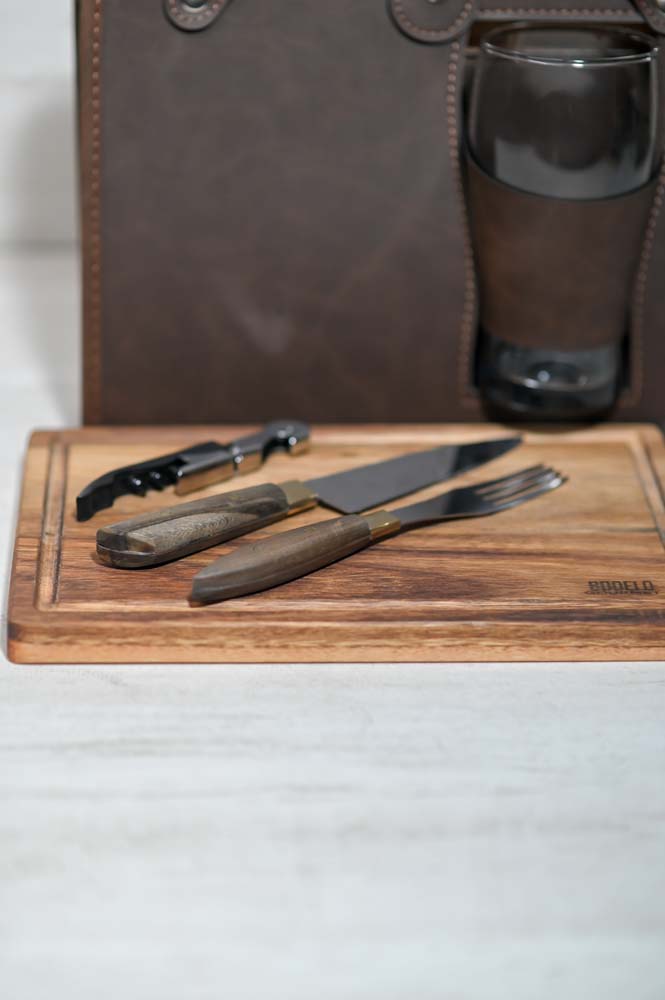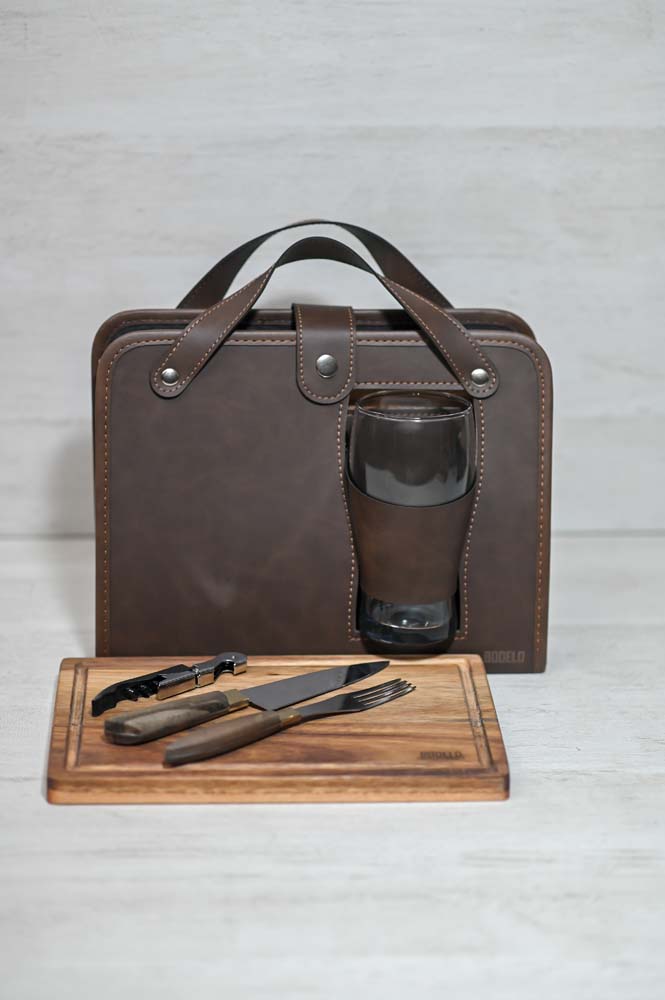 - Compartimiento interno para cubiertos, tabla, destapador y vaso pinta de vidrio.